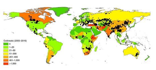 炭疽芽孢桿菌自然疫源地在全球分布廣泛,常見于農(nóng)牧業(yè)發(fā)達地區(qū)。目前沒有任何一個國家完全消滅炭疽,說明疫源地一旦產(chǎn)生后非常頑固。下圖展示了2005-2016年炭疽疫情全球分布圖(Carlson CJ, et al. Nat Microbiol, 2019),黑點代表1次疫情及其定位。