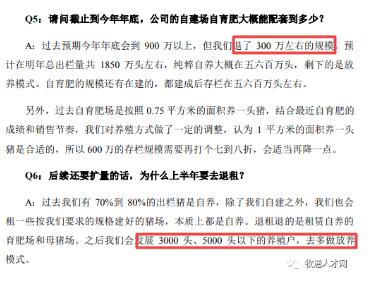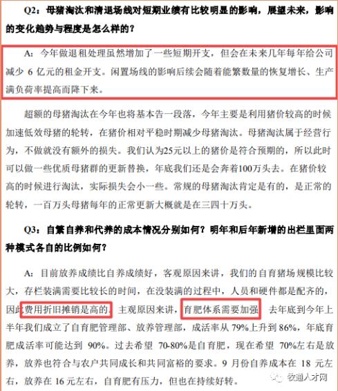 新希望9月份自養(yǎng)成本18元左右,放養(yǎng)16元左右;自育豬場(chǎng)規(guī)模比較大,存欄裝滿需較長(zhǎng)時(shí)間,在沒(méi)裝滿的過(guò)程中,人員和硬件都是配齊的,因此費(fèi)用折舊攤銷(xiāo)高。過(guò)去希望70—80%是自育肥,現(xiàn)在希望70%左右是放養(yǎng),放養(yǎng)也符合與農(nóng)戶共同成長(zhǎng)和共同富裕的要求。