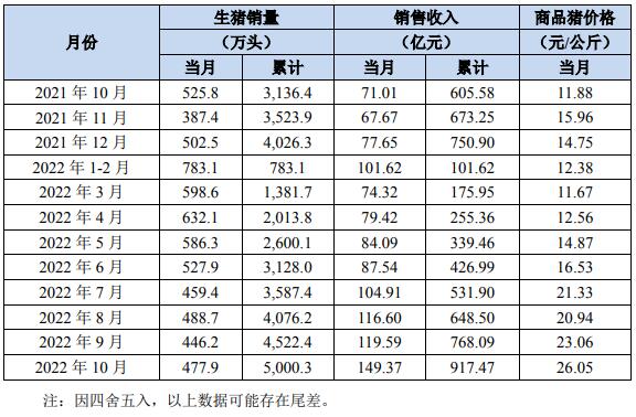 牧原股份11月7日公布2022年10月份生豬銷售簡報。10月份,公司銷售生豬477.9萬頭(其中仔豬銷售18.5萬頭),銷售收入149.37億元。其中向全資子公司牧原肉食品有限公司及其子公司合計銷售生豬61.2萬頭。