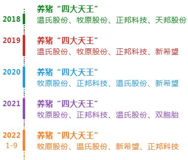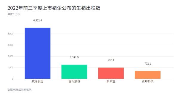 而根據(jù)2022年前三季度上市豬企公布的生豬出欄數(shù)據(jù),“四大天王”分別是:牧原股份(4522.4萬頭)、溫氏股份(1241.9萬頭)、新希望(990.1萬頭)、正邦科技(702.1萬頭)。