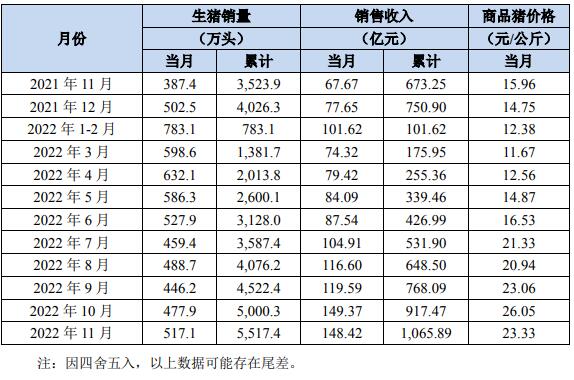 牧原股份12月6日公布2022年11月份生豬銷售簡(jiǎn)報(bào)。2022年11月份,公司銷售生豬517.1萬頭(其中仔豬銷售8.8萬頭),銷售收入148.42億元。其中向全資子公司牧原肉食品有限公司及其子公司合計(jì)銷售生豬73.9萬頭。
