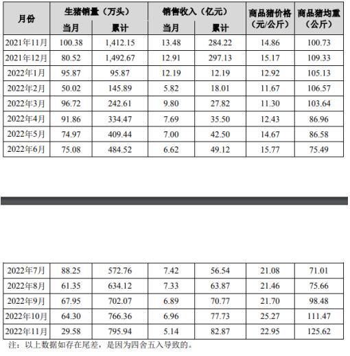 正邦科技12月8日發(fā)布2022年11月份生豬銷售情況簡報(bào)。11月,正邦科技銷售生豬29.58萬頭(其中仔豬14.63萬頭,商品豬14.95萬頭),環(huán)比下降54.00%,同比下降70.53%;銷售收入5.14億元,環(huán)比下降26.22%,同比下降61.90%。