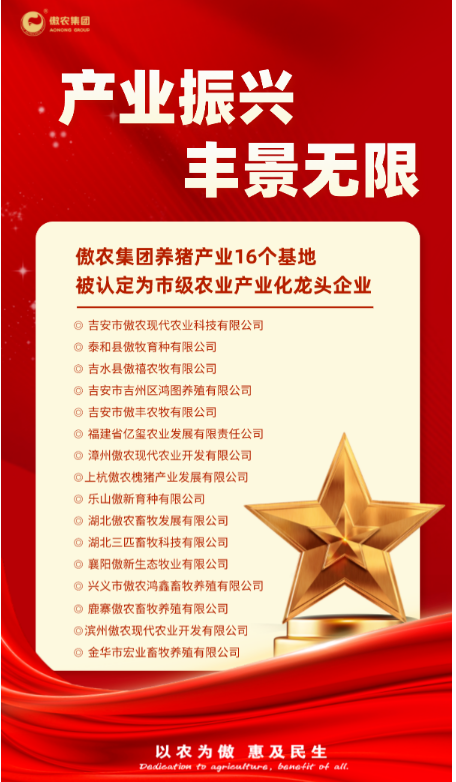 ??農(nóng)業(yè)產(chǎn)業(yè)化龍頭企業(yè)是推進(jìn)農(nóng)業(yè)產(chǎn)業(yè)化經(jīng)營(yíng)的核心,在提高農(nóng)業(yè)組織化程度、加快轉(zhuǎn)變農(nóng)業(yè)發(fā)展方式、推動(dòng)農(nóng)業(yè)規(guī)模經(jīng)營(yíng)和帶動(dòng)農(nóng)民就業(yè)增收中具有十分重要的作用。傲農(nóng)在發(fā)展過(guò)程中始終心系農(nóng)村、扎根農(nóng)業(yè),對(duì)農(nóng)業(yè)產(chǎn)業(yè)化龍頭企業(yè)創(chuàng)建工作也高度重視。通過(guò)大力發(fā)展產(chǎn)業(yè)、上延下伸業(yè)務(wù)、做強(qiáng)傲農(nóng)品牌,傲農(nóng)逐步在內(nèi)部打造出了農(nóng)業(yè)產(chǎn)業(yè)化龍頭企業(yè)“雁陣”,讓“小金豬”在基地所在縣市成為“大”產(chǎn)業(yè)、產(chǎn)生“大”效益,切實(shí)推動(dòng)鄉(xiāng)村產(chǎn)業(yè)高質(zhì)量發(fā)展。