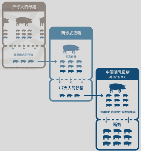 4、將12-48小時內(nèi)產(chǎn)仔的母豬(產(chǎn)仔多的母豬)中較大的仔豬與寄養(yǎng)母豬(兩步式哺乳母豬)放在一起。