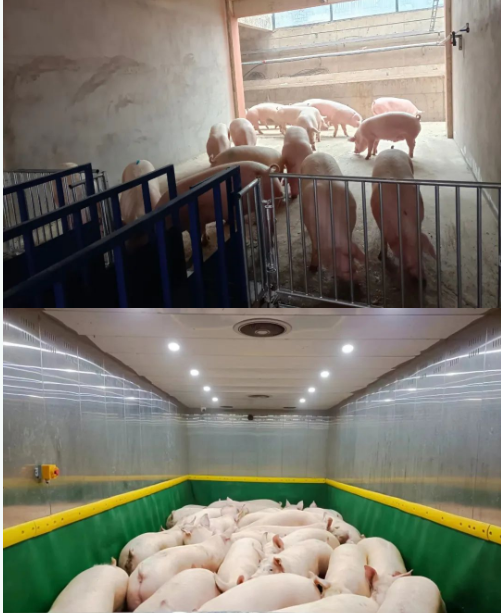 早上5點,三臺全封閉空調(diào)運豬車到達(dá)湖北中新開維現(xiàn)代牧業(yè)洗消中心進(jìn)行洗消烘,7點車輛準(zhǔn)時到達(dá)湖北中新開維現(xiàn)代牧業(yè)出豬站區(qū)域再次消毒,運豬車司機及現(xiàn)場人員在南廂房烘干間干烘10分鐘后洗澡10分鐘,洗完澡后統(tǒng)一穿戴一次性防護服、口罩和鞋套,確保整個出豬過程安全、高效。