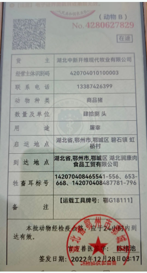 出欄前,碧石渡鎮(zhèn)畜牧站在現(xiàn)場對上市金豬的健康狀態(tài)和免疫疫苗注射等情況進(jìn)行了檢查,138頭金豬平均重量達(dá)到了301斤,經(jīng)檢測,全部達(dá)到了出欄的標(biāo)準(zhǔn),并現(xiàn)場開具了三臺車輛出豬的檢疫票。