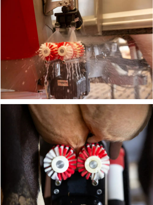 在傳統(tǒng)牧場,奶牛到擠奶廳擠奶,需要人工每日二到三次清潔乳頭和乳房。