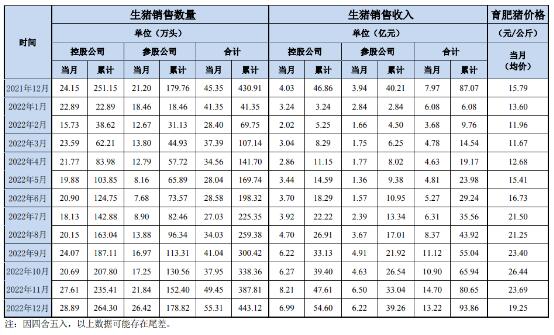 2022年1-12月,控股公司累計銷售生豬264.30萬頭,同比增長5.24%。累計銷售收入54.60億元,同比增長 16.52%。