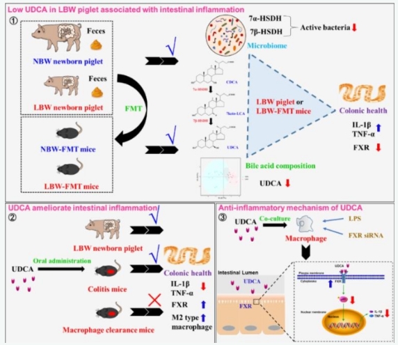 研究結(jié)果顯示,LBW和正常出生體重新生仔豬的糞便微生物組和BAs分布均存在顯著性差異,特別是熊脫氧膽酸(UDCA)在LBW仔豬腸道中顯著降低,并伴隨著與UDCA合成相關(guān)菌群的豐度降低,如7α-羥基類固醇脫氫酶(7α-HSDH)和7β-羥基類固醇脫氫酶(7β-HSDH)(這些微生物能夠?qū)⒛c道中的鵝脫氧膽酸CDCA轉(zhuǎn)化為UDCA)。進(jìn)一步將LBW新生仔豬的糞菌移植到抗生素清菌后的小鼠體內(nèi),可導(dǎo)致受體鼠腸道炎癥增強(qiáng)、腸道中UDCA含量降低、7α-HSDH和7β-HSDH相關(guān)膽汁酸代謝菌的豐度降低。重要的是,口服UDCA(在LBW仔豬腸道中減少的主要膽汁酸)可通過促進(jìn)巨噬細(xì)胞向M2型極化從而顯著緩解LBW仔豬、LBW-FMT受體小鼠和結(jié)腸炎造模小鼠的腸道炎癥。在分子機(jī)制上,UDCA是通過與BAs受體法尼醇受體(FXR)結(jié)合、抑制巨噬細(xì)胞中NF-κB信號通路的活化,從而減少腸道炎性細(xì)胞因子的產(chǎn)生。