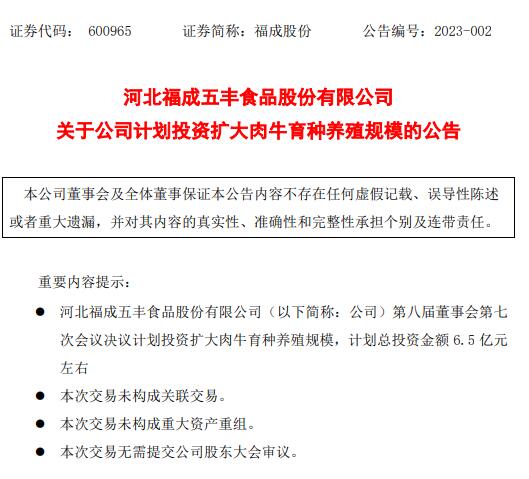 2月7日,福成股份發(fā)布公告,2023年公司計(jì)劃將投資6.5億元左右擴(kuò)大肉牛育種養(yǎng)殖規(guī)模。其中3億元左右用于建設(shè)兩個可容納1萬頭牛規(guī)模的養(yǎng)牛場,計(jì)劃2023年內(nèi)建設(shè)完成;3億元左右用于采購約2萬頭活牛;5000萬元左右建立一個優(yōu)質(zhì)種牛培育中心。