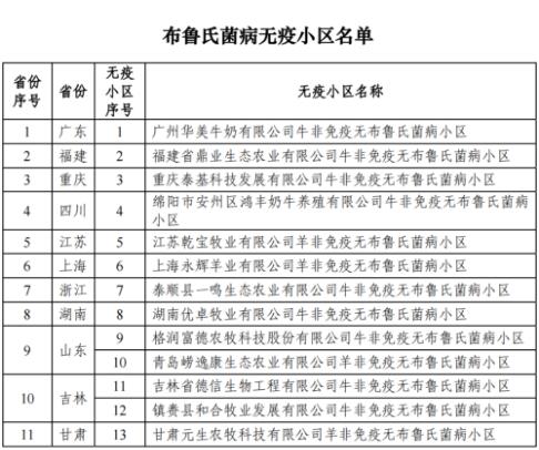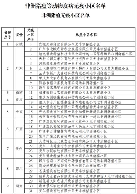 根據(jù)《中華人民共和國動(dòng)物防疫法》《無規(guī)定動(dòng)物疫病小區(qū)評(píng)估管理辦法》及有關(guān)規(guī)定,安徽等19個(gè)省份的50個(gè)非洲豬瘟無疫小區(qū)、13個(gè)布魯氏菌病無疫小區(qū)、3個(gè)牛結(jié)核病無疫小區(qū)達(dá)到有關(guān)疫病無疫標(biāo)準(zhǔn),江蘇省的1個(gè)非洲豬瘟無疫小區(qū)增加生產(chǎn)單元,已通過國家評(píng)估,具體名單如下。