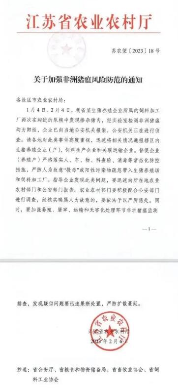 通知稱,1月4日、2月4日,江蘇省某生豬養(yǎng)殖企業(yè)所屬的飼料加工廠兩次在購(gòu)進(jìn)的原糧中發(fā)現(xiàn)摻雜豬肉,經(jīng)實(shí)驗(yàn)室檢測(cè)非洲豬瘟均為陽性,企業(yè)已向當(dāng)?shù)毓矙C(jī)關(guān)報(bào)案,公安機(jī)關(guān)正在進(jìn)行偵查。