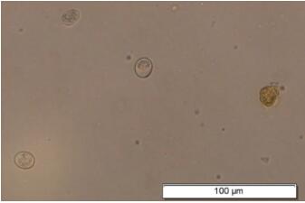 不同球蟲(chóng)有不同形態(tài),雖然大同小異,但是對(duì)球蟲(chóng)的觀察需要現(xiàn)場(chǎng)經(jīng)驗(yàn)。糞便中牛球蟲(chóng)卵囊為圓形或橢圓形,大小17~49×12~35μm。