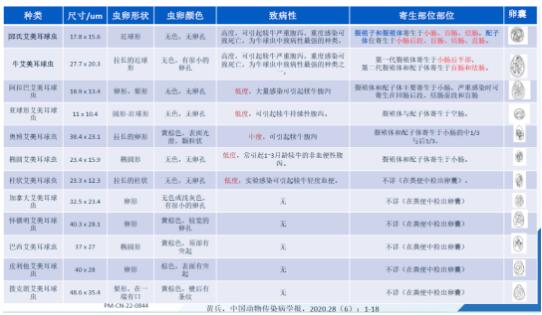 上圖是目前國(guó)內(nèi)可以分離到的一些球蟲(chóng)種類(lèi),排在前兩位的是邱氏艾美耳球蟲(chóng)和牛艾美耳球蟲(chóng)。另外,阿拉巴艾美耳球蟲(chóng)、橢圓艾美耳球蟲(chóng)和柱狀艾美耳球蟲(chóng)的致病性是低度或中度,遠(yuǎn)不如邱氏和牛艾美耳球蟲(chóng)的致病性強(qiáng)。此外,這些球蟲(chóng)的腸道寄生部位也不一樣,有些主要在小腸,有些在小腸和大腸。