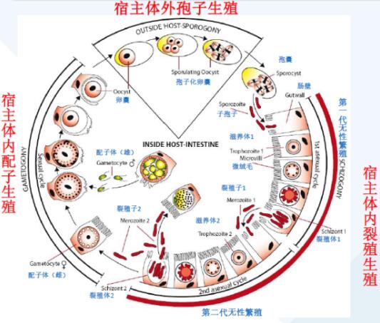 想要控制好球蟲(chóng),首先要對(duì)球蟲(chóng)的生活史有詳細(xì)了解。球蟲(chóng)生活史實(shí)際上分為兩部分:體外的生殖階段和體內(nèi)的生殖階段。體內(nèi)生殖階段是因?yàn)轶w外感染性卵囊被牛食入,食入后在體內(nèi)先分化成子孢子,進(jìn)入到腸道上皮細(xì)胞,然后在細(xì)胞中不斷分化,變成裂殖子,最后成熟變成裂殖體,裂殖體再進(jìn)入到細(xì)胞進(jìn)入第二代裂殖生殖,裂殖生殖階段也稱(chēng)為無(wú)性繁殖階段。