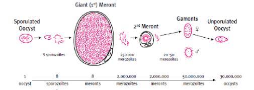 從上圖可以看出來(lái),牛食入1個(gè)感染性卵囊,第一代裂殖生殖可以形成200萬(wàn)個(gè)第一代裂殖體,其中每個(gè)都可以再分化出20-50個(gè),最終生成5000萬(wàn)個(gè)第二代裂殖子,然后通過(guò)有性繁殖變成雄配體和雌配體,重新組裝變成新的卵囊,最后可排出體外3000萬(wàn)個(gè)卵囊。這些卵囊排泄到環(huán)境中,它并不是感染性卵囊,需要一定的溫度和濕度變成感染性卵囊,然后重新再被牛食入,進(jìn)入到第二次體內(nèi)生殖階段。