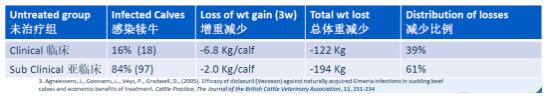 未治療組通過(guò)臨床癥狀分成有臨床表現(xiàn)和亞臨床表現(xiàn)兩組。通過(guò)增重監(jiān)測(cè),有臨床表現(xiàn)組每頭牛增重減少6.8公斤,18頭牛合計(jì)減少122公斤。亞臨床表現(xiàn)組牛頭數(shù)更多,雖然每頭牛體重減少只有兩公斤,但總體重減少194公斤。從比例來(lái)看,亞臨床表現(xiàn)組對(duì)增重的減少比例占61%。