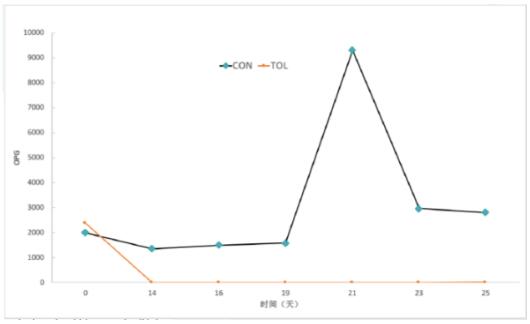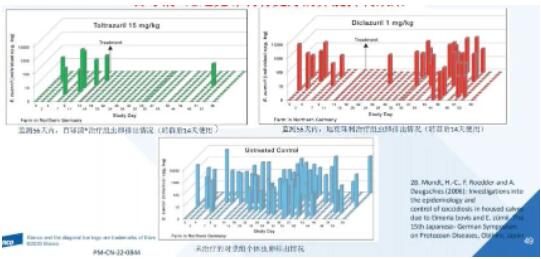 上圖是卵囊跟蹤檢測(cè)的數(shù)據(jù),只跟蹤到第25天。從圖中可以看出,使用托曲珠利(百球清)預(yù)防組曲線(xiàn)比較平穩(wěn),基本檢測(cè)不出卵囊。而對(duì)照組卵囊處于較高的狀態(tài),尤其某個(gè)階段會(huì)爆發(fā)。