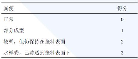 另外,每次采樣對(duì)腹瀉進(jìn)行評(píng)分,實(shí)行三分制。0分是正常;1分是部分成型;2分是較稀,但仍可以保持在墊料表面上;3分是水樣糞,已滲透到墊料表面下。