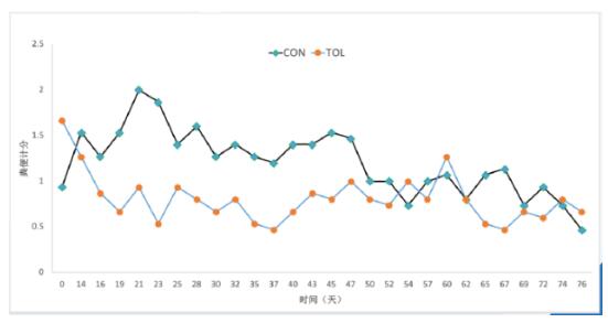從上圖腹瀉評(píng)分結(jié)果可以清晰看出,使用百球清預(yù)防組,腹瀉評(píng)分基本在1分以下,呈現(xiàn)正常的糞便狀態(tài)。而沒(méi)有采用藥物預(yù)防的對(duì)照組,評(píng)分都在1分以上,有的甚至達(dá)到2分,經(jīng)過(guò)近兩個(gè)月飼養(yǎng)后,部分牛的糞便才回歸到正常。