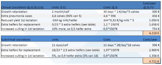 國(guó)外有研究報(bào)道,有球蟲(chóng)亞臨床感染的犢牛可以導(dǎo)致35天的嚴(yán)重生長(zhǎng)遲緩,與對(duì)照治療組日增重 870克相比,受感染犢牛日增重僅600 克,這相當(dāng)于9.45公斤的生長(zhǎng)遲緩??紤]到 6月時(shí)體重與初產(chǎn)年齡之間的關(guān)系,后者將增加 0.9個(gè)月的飼養(yǎng)時(shí)間,從而增加飼養(yǎng)成本。