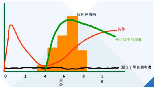 初乳保護(hù)一般1-2周,當(dāng)母源保護(hù)作用減弱時(shí),犢牛從環(huán)境中獲得的卵囊可以在腸內(nèi)迅速繁殖,經(jīng)過(guò)21天再排出卵囊。如果環(huán)境中卵囊數(shù)量比較少,犢牛接觸少量的卵囊,通過(guò)卵囊不斷刺激腸道淋巴細(xì)胞產(chǎn)生免疫力。如果接觸過(guò)量卵囊,突破了免疫屏障,犢牛就會(huì)表現(xiàn)出臨床癥狀。所以,在幫助犢牛建立免疫力的過(guò)程中,我們一定要加強(qiáng)對(duì)環(huán)境的管理和控制,因?yàn)樯倭柯涯掖嬖谟幸欢ㄒ嫣?,但大量卵囊的危害比較嚴(yán)重。
