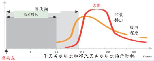 用藥時(shí)間對(duì)于控制球蟲(chóng)至關(guān)重要,潛伏期進(jìn)行治療能夠保證動(dòng)物不遭受疾病痛苦,而且對(duì)腸道的損傷不大,還能刺激腸道產(chǎn)生一些免疫力。若在已經(jīng)排出蟲(chóng)卵后再進(jìn)行治療,只能控制后續(xù)的惡化。