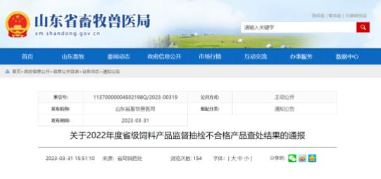近日,山東省畜牧獸醫(yī)局發(fā)布《關(guān)于2022年度省級飼料產(chǎn)品監(jiān)督抽檢不合格產(chǎn)品查處結(jié)果的通報》。