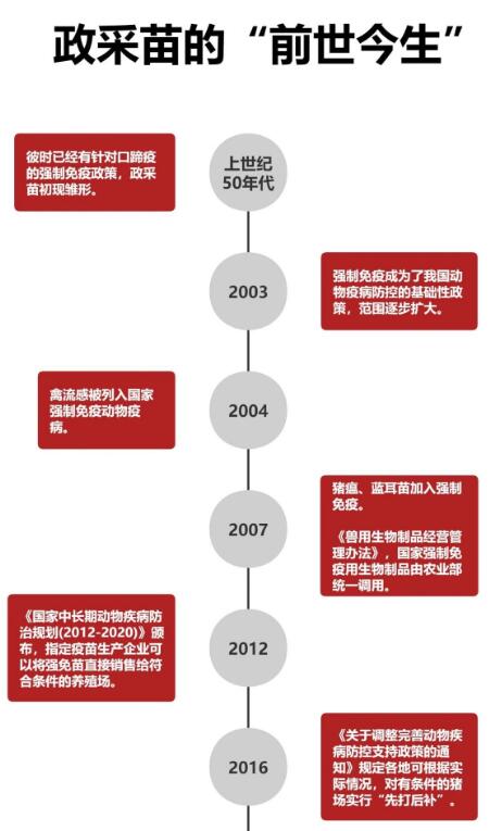 回顧我國(guó)重大動(dòng)物疫病實(shí)施政府集中采購(gòu)疫苗的歷史,最早可追溯至上世紀(jì)50年代。彼時(shí)已經(jīng)有針對(duì)口蹄疫的強(qiáng)制免疫政策。2003年之后,隨著養(yǎng)殖業(yè)的發(fā)展以及一些疫情的爆發(fā),國(guó)家對(duì)重大動(dòng)物疫病的防控更加重視。為了提高全國(guó)重大動(dòng)物疫病免疫覆蓋率,提高養(yǎng)殖場(chǎng)戶免疫積極性,我國(guó)推行重大動(dòng)物疫病強(qiáng)制免疫政策并配套實(shí)施疫苗政府集中采購(gòu)。