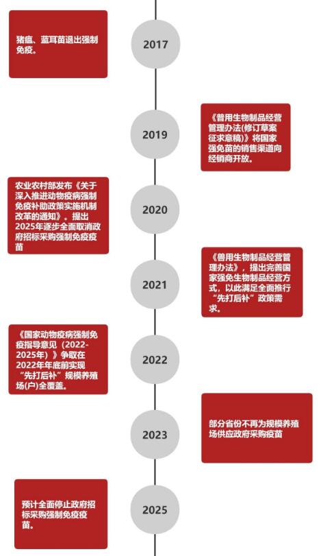 2020年11月23日,農(nóng)業(yè)農(nóng)村部發(fā)布《關(guān)于深入推進(jìn)動(dòng)物疫病強(qiáng)制免疫補(bǔ)助政策實(shí)施機(jī)制改革的通知》,提出2022年全國(guó)所有省份的規(guī)模養(yǎng)殖場(chǎng)戶實(shí)現(xiàn)"先打后補(bǔ)",年底前政府招標(biāo)采購(gòu)強(qiáng)免疫苗停止供應(yīng)規(guī)模養(yǎng)殖場(chǎng)戶,2025年逐步全面取消政府招標(biāo)采購(gòu)強(qiáng)免疫苗。