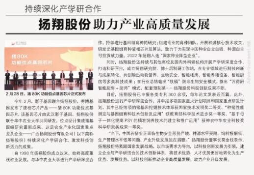 自1998年成立以來,揚(yáng)翔股份始終高度重視種業(yè)發(fā)展,與華中農(nóng)業(yè)大學(xué)進(jìn)行產(chǎn)學(xué)研深度合作,持續(xù)進(jìn)行基因組育種的研究;組建專業(yè)的育種團(tuán)隊(duì),開展種源核心技術(shù)攻關(guān),研發(fā)出基因組育種液相芯片及算法,致力于為實(shí)現(xiàn)中國種業(yè)自立自強(qiáng)、種源自主可控貢獻(xiàn)力量。2022年,揚(yáng)翔股份入選“國家種業(yè)陣型企業(yè)”。