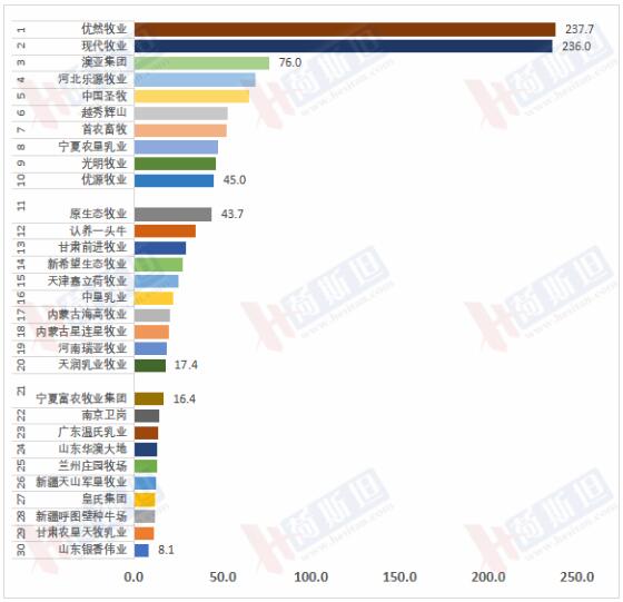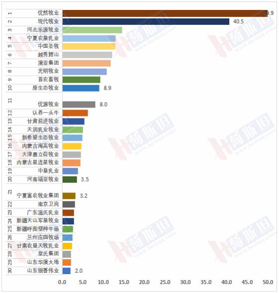 Top30牧業(yè)集團(tuán)中,優(yōu)然牧業(yè)奶牛存欄49.9萬頭,以絕對優(yōu)勢踞榜首;現(xiàn)代牧業(yè)存欄40.5萬頭,居第二位,其余超過10萬頭存欄的有六家,分別是河北樂源牧業(yè)14.5萬頭,寧夏農(nóng)墾乳業(yè)13.0萬頭,中國圣牧12.8萬頭,越秀輝山12.2萬頭,澳亞集團(tuán) 11.8萬頭,光明牧業(yè)10.8萬頭。