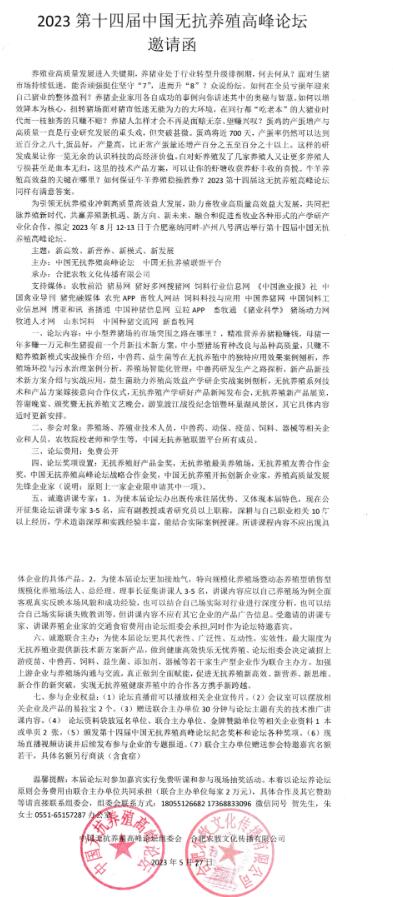 為引領(lǐng)無抗養(yǎng)殖業(yè)沖刺高質(zhì)量高效益大發(fā)展,助力畜牧業(yè)高質(zhì)量高效益大發(fā)展,共同把脈養(yǎng)殖新時(shí)代,共贏養(yǎng)殖新機(jī)遇、新方向、新未來,融合和促進(jìn)畜牧業(yè)各種形式的產(chǎn)學(xué)研產(chǎn)業(yè)化合作,擬定2023年8月12-13日于合肥塞納河畔-廬州八號(hào)酒店舉行第十四屆中國無抗養(yǎng)殖高峰論壇。