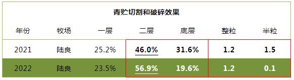 經(jīng)過這次調(diào)整后,牧場深刻意識到青貯粗細(xì)度以及均勻度的重要性,2022年收青貯時只用收割機(jī),青貯的切割質(zhì)量顯著高于2021年,二層接近57%,破碎度也不錯,整粒的玉米大概只有1.2克,為今年的單產(chǎn)以及飼料轉(zhuǎn)化率也打下了一個良好的基礎(chǔ)。