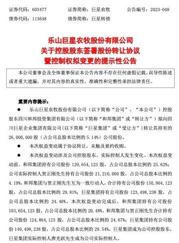 8月7日,巨星農(nóng)牧發(fā)布公告稱,控股股東和邦集團已簽署《股份轉(zhuǎn)讓協(xié)議》,約定以27.67元/股的價格將其所持2600萬股公司股份(占巨星農(nóng)牧總股本的5.14%)轉(zhuǎn)讓給巨星集團,股份轉(zhuǎn)讓價款合計7.19億元。權(quán)益變動后,巨星農(nóng)牧控股股東將由和邦集團變更為巨星集團,公司實際控制人將由賀正剛變更為唐光躍。