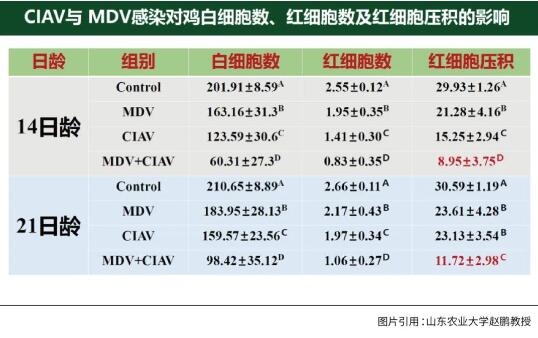 ①對細胞壓積的影響:通過實驗數(shù)據(jù)我們看到,正常雞紅細胞壓積HCT值為29,符合國際普遍27以上的正常標準,傳貧單獨感染組HCT值是15,但是當(dāng)傳貧和馬立克兩個共染之后雞的紅細胞壓積是8.9,只有正常雞1/4 左右的水平。我們都知道,紅細胞不僅能運輸氧還有很強的免疫功能,紅細胞壓積這么低,雞的免疫機能也會受影響。雖然雞到了21日齡有所緩和,但這兩種病毒共感染相對于傳貧單感染或者雞馬立克單感染以及正常的雞依然有很大差別。雖然28日齡、35日齡時有所恢復(fù),但仍無法恢復(fù)到正常雞的水平,這就是共感染對紅細胞壓積也就是貧血的不良影響。