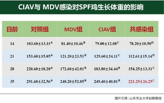 ②對生長性能的影響。傳貧和雞馬立克兩種病毒單感染對生產(chǎn)性能有一定的影響,但兩種病毒共感染之后影響更大。比如到35日齡時,共感染組雞相對于正常雞平均體重相差了約70克,與單感染組相比體重相差了約20克,所以共感染對生產(chǎn)性能的影響非常明顯。