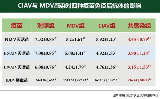 ③對疫苗免疫后抗體的影響。我們評估了傳貧感染對四種疫苗免疫的影響,包括新城疫滅活苗,禽流感的 H5和H9以及傳染性法氏囊疫苗,毫無疑問共感染組與對照組有顯著性差異。對新城疫來講,正常的雞是7.32,共感染組是4.45。對H5亞型禽流感疫苗來講,正常的雞是7,共感染組是3.8;H9亞型禽流感疫苗正常雞是6,共感染組是3;法氏囊疫苗正常雞滴度是2441,共感染組是996。共感染的危害不僅與正常雞相比差異顯著,與單獨感染一種病毒的雞相比,共感染的危害也很明顯。