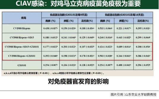 傳貧為什么會導(dǎo)致馬立克疫苗免疫失敗?它對雞馬立克疫苗免疫有哪些影響?在沒有傳貧存在的情況下,比如在一次實驗中,CVI 988疫苗能夠?qū)姸竟ザ咎峁?5%的保護,但一旦有了傳貧,它的保護率就降到了54%。另外,傳貧還會影響疫苗免疫后雞的生長性能,免疫CVI988后有傳貧病毒的雞比沒有傳貧病毒的雞體重大概差了30克。此外,傳貧還影響免疫器官的發(fā)育,以胸腺為例,兩個組都免CVI 988,但一個組攜帶傳貧,一個組不攜帶傳貧,實驗證明,攻毒9天后攜帶傳貧的SPF雞胸腺發(fā)育指數(shù)是0.17,不攜帶傳貧的胸腺發(fā)育指數(shù)是0.39,發(fā)育指數(shù)值越小說明胸腺萎縮越嚴重。16天時這種差別更大,攜帶傳貧的胸腺發(fā)育指數(shù)是0.12,不攜帶傳貧的胸腺發(fā)育指數(shù)是0.50,也就是說攜帶傳貧病毒感染的雞胸腺萎縮到正常雞約1/4的水平。
