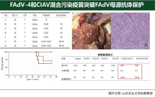 2016 年我國出現(xiàn)安卡拉病后,我戲稱傳貧和腺病毒是咖啡和伴侶,它們離了誰都不香。比如,我們率先從某新城疫活疫苗中檢出傳貧和腺病毒的混合污染,花了很大的力氣把這兩個病毒純化出來,進行重復(fù)模擬實驗。最后我們發(fā)現(xiàn),單獨污染腺病毒的疫苗使用后并沒有像臨床上80%那樣的死亡率,但同樣的腺病毒和同樣的劑量,加上傳貧混合污染后的疫苗再使用,就出現(xiàn)了高達75%的死亡率,非常切合當(dāng)時臨床實際情況。