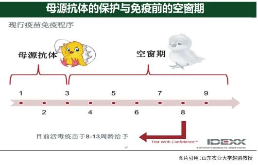 我們通常通過免疫或自然感染誘導(dǎo)后,再監(jiān)測種源的傳貧抗體滴度、整齊度、離散度,以及監(jiān)測下一代雛雞的母源抗體滴度、整齊度、離散度。我們希望抗體滴度越高越好,離散度越低越好。無論用什么方式實現(xiàn)了這個目標,臨床上一般不會出現(xiàn)傳貧的問題。所以傳貧防控的核心一直是讓雞獲得足夠的高質(zhì)量的母源抗體,以此擋住傳貧的早期感染,如果能擋住早期感染,即使大日齡的雞再感染也會很容易產(chǎn)生傳貧抗體,不容易形成持續(xù)性帶毒或者垂直傳播,從而又容易產(chǎn)生新的抗體,形成新一輪的抗體循環(huán)。我們希望母源抗體能在傳貧最易感的時期保護雞群免于感染,以避免長期持續(xù)帶毒及形成垂直傳播的可能性。對于傳貧,無論是疫苗免疫還是自然感染誘導(dǎo),我們希望抗體升上去后在整個產(chǎn)蛋期保持非常平穩(wěn)的狀態(tài)。