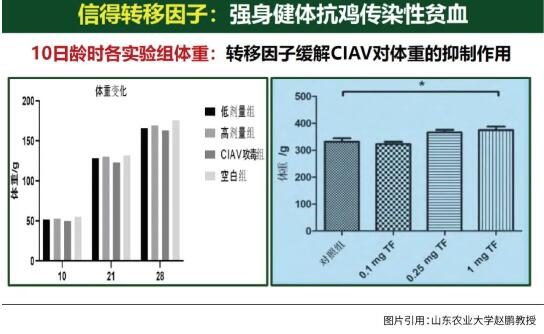 拋開抑制病毒感染而言,信得轉(zhuǎn)移因子對生長性能也有促進作用。實驗中我們發(fā)現(xiàn),使用了高劑量信得轉(zhuǎn)移因子的實驗組雞群,即便有傳貧感染體重仍然能夠接近正常SPF雞的水平。