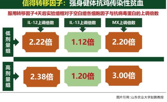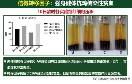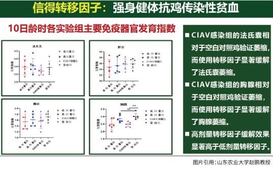 轉(zhuǎn)移因子對緩解傳貧感染的作用非常明顯。實驗表明,感染傳貧的雞經(jīng)高劑量轉(zhuǎn)移因子抑制后和正常的雞紅細胞壓積幾乎沒有差別,不僅如此,它還能夠抑制傳貧在體內(nèi)的復(fù)制。不僅在血液里邊,在肝臟、胸腺中信必妥對傳貧的復(fù)制也有顯著的抑制作用。可以說,不管是低日齡還是高日齡,高劑量的轉(zhuǎn)移因子對傳貧都有非常明顯的抑制作用。