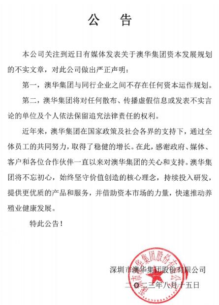 澳華集團(tuán)稱,近年來澳華集團(tuán)在國家政策和社會各界的支持下,通過全體員工的共同努力,取得了穩(wěn)健的增長。在此,感謝政府、媒體、客戶和各位合作伙伴一直以來對澳華集團(tuán)的關(guān)心和支持。澳華集團(tuán)將不忘初心,始終堅(jiān)守價(jià)值創(chuàng)造的核心理念,持續(xù)投入研發(fā),提供更優(yōu)質(zhì)的產(chǎn)品和服務(wù),并借助資本市場的力量,快速推動(dòng)養(yǎng)殖業(yè)健康發(fā)展。