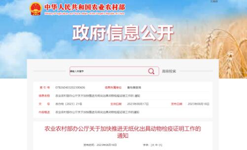 農(nóng)業(yè)農(nóng)村部辦公廳關(guān)于加快推進無紙化出具動物檢疫證明工作的通知