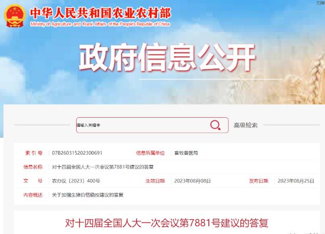 農(nóng)業(yè)農(nóng)村部在25日發(fā)布的《對十四屆全國人大一次會議第7881號建議的答復(fù)》中回復(fù)了有關(guān)建立生豬價格保險機制和實施養(yǎng)殖大戶獎補政策方面的問題。