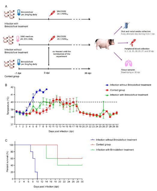 針對(duì)當(dāng)前缺乏有效的抗ASFV藥物的現(xiàn)狀,陳煥春院士、王湘如教授團(tuán)隊(duì)基于原代豬肺泡巨噬細(xì)胞建立了一種抗ASFV化合物篩選模型,利用該模型對(duì)含有298種化合物的激酶抑制劑庫進(jìn)行篩選,共篩選到6種對(duì)ASFV抑制率大于90%的候選化合物,其中Brincidofovir(布羅福韋酯)對(duì)ASFV表現(xiàn)出最佳的抑制效果。通過體外實(shí)驗(yàn)發(fā)現(xiàn),Brincidofovir能夠劑量依賴性的抑制ASFV的復(fù)制(IC50=2.76nM),無細(xì)胞毒性(CC50=58μM),且Brincidofovir可以顯著降低ASFV的病毒滴度,抑制病毒結(jié)構(gòu)蛋白的表達(dá)。通過藥物添加試驗(yàn)結(jié)果顯示,Brincidofovir作用于病毒進(jìn)入后階段。體內(nèi)實(shí)驗(yàn)數(shù)據(jù)表明,Brincidofovir能夠有效抑制ASFV在豬體內(nèi)的復(fù)制和水平傳播。感染ASFV的仔豬在口服Brincidofovir后,存活率顯著提高,感染導(dǎo)致的高熱、病毒血癥、排毒及組織病理損傷顯著降低。該研究首次發(fā)現(xiàn)并驗(yàn)證了Brincidofovir對(duì)ASFV在體外和體內(nèi)的抑制活性,為預(yù)防和控制非洲豬瘟藥物的開發(fā)提供了新的思路和策略。