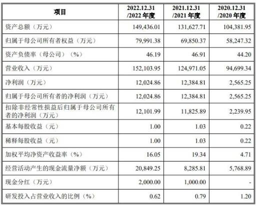 財(cái)務(wù)方面,于2020年度、2021年度、2022年度,公司實(shí)現(xiàn)營(yíng)業(yè)收入分別為9.47億元、12.5億元、15.21億元,期內(nèi),公司實(shí)現(xiàn)凈利潤(rùn)分別為0.26億元、1.24億元、1.2億元。