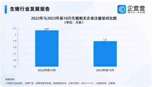 企查查數(shù)據(jù)顯示,截至目前,今年我國新增1.97萬家生豬相關(guān)企業(yè)。2022年及2023年前10月,分別新增生豬相關(guān)企業(yè)2.07萬家、1.9萬家,同比減少7.88%。