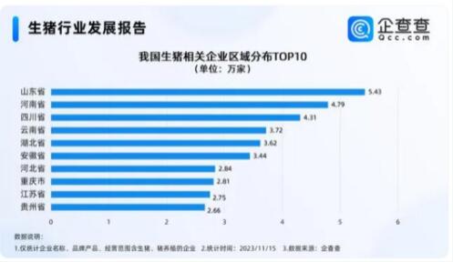 企查查數(shù)據(jù)顯示,我國現(xiàn)存生豬相關(guān)企業(yè)57.52萬家。近十年,我國生豬相關(guān)企業(yè)受豬肉價格波動、規(guī)?;訌姷扔绊懀粤砍试鰷p不定態(tài)勢。2020年,我國生豬相關(guān)企業(yè)新增7.23萬家,同比增長47.79%。2021年,我國生豬相關(guān)企業(yè)新增3.51萬家,同比減少51.41%。2022年,我國生豬相關(guān)企業(yè)新增2.52萬家,同比減少28.36%。截至目前,今年我國新增生豬相關(guān)企業(yè)1.97萬家,其中,2023年前10月,新增生豬相關(guān)企業(yè)1.9萬家,同比減少7.88%。從區(qū)域來看,山東現(xiàn)存5.43萬家生豬相關(guān)企業(yè),位居第一。河南、四川分別現(xiàn)存4.79萬家、4.31萬家生豬相關(guān)企業(yè),位居前三。此后是云南、湖北、安徽、河北等地。